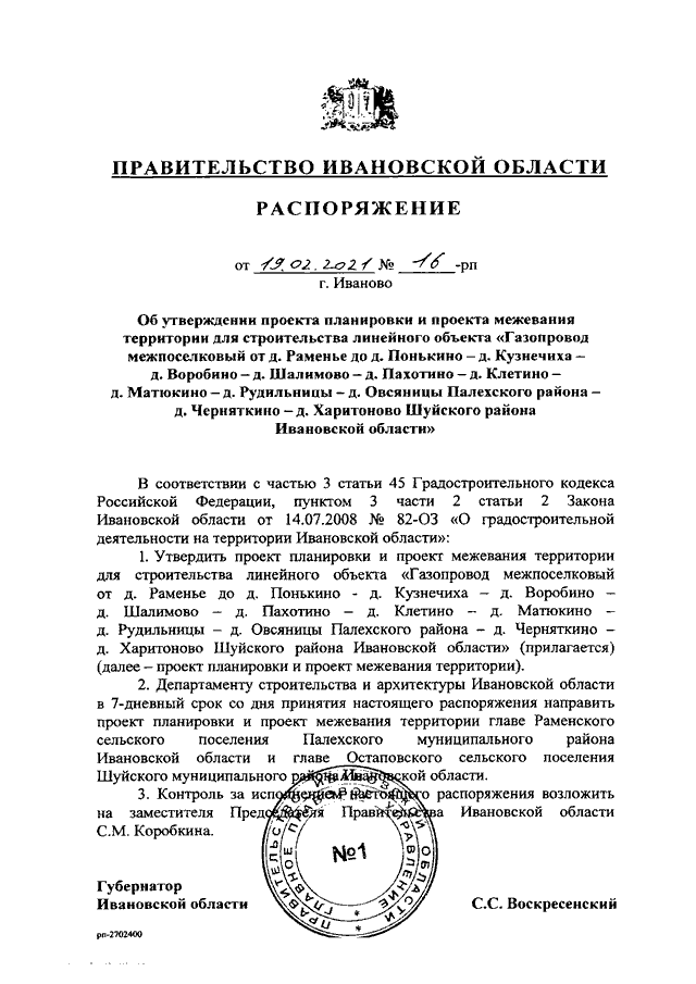 Распоряжение Правительства Ивановской области от 19.02.2021 N 16-рп "Об утверждении проекта планировки и проекта межевания территории для строительства линейного объекта "Газопровод межпоселковый от д. Раменье до д. Понькино - д. Кузнечиха - д. Воробино - д. Шалимово - д. Пахотино - д. Клетино - д. Матюкино - д. Рудильницы - д. Овсяницы Палехского района - д. Черняткино - д. Харитоново Шуйского района Ивановской области"