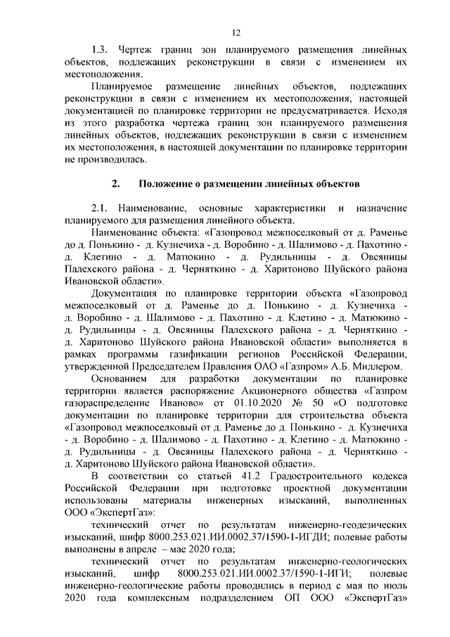Распоряжение Правительства Ивановской области от 19.02.2021 N 16-рп "Об утверждении проекта планировки и проекта межевания территории для строительства линейного объекта "Газопровод межпоселковый от д. Раменье до д. Понькино - д. Кузнечиха - д. Воробино - д. Шалимово - д. Пахотино - д. Клетино - д. Матюкино - д. Рудильницы - д. Овсяницы Палехского района - д. Черняткино - д. Харитоново Шуйского района Ивановской области"