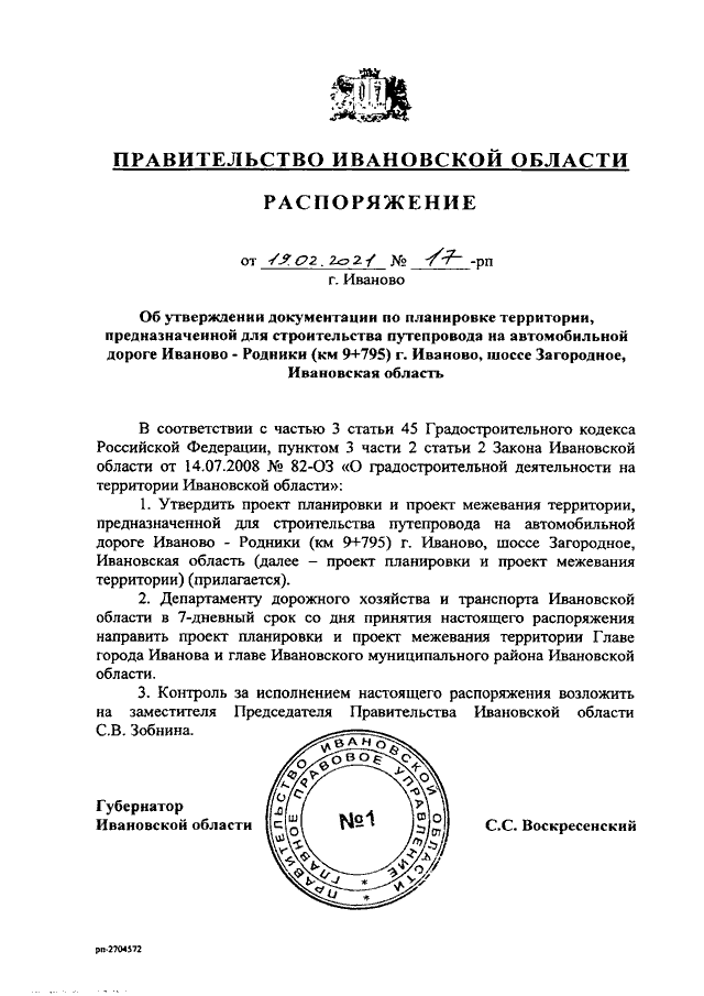 Распоряжение Правительства Ивановской области от 19.02.2021 N 17-рп "Об утверждении документации по планировке территории, предназначенной для строительства путепровода на автомобильной дороге Иваново - Родники (км 9 + 795) г. Иваново, шоссе Загородное, Ивановская область"