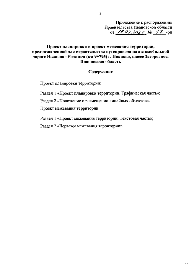 Распоряжение Правительства Ивановской области от 19.02.2021 N 17-рп "Об утверждении документации по планировке территории, предназначенной для строительства путепровода на автомобильной дороге Иваново - Родники (км 9 + 795) г. Иваново, шоссе Загородное, Ивановская область"