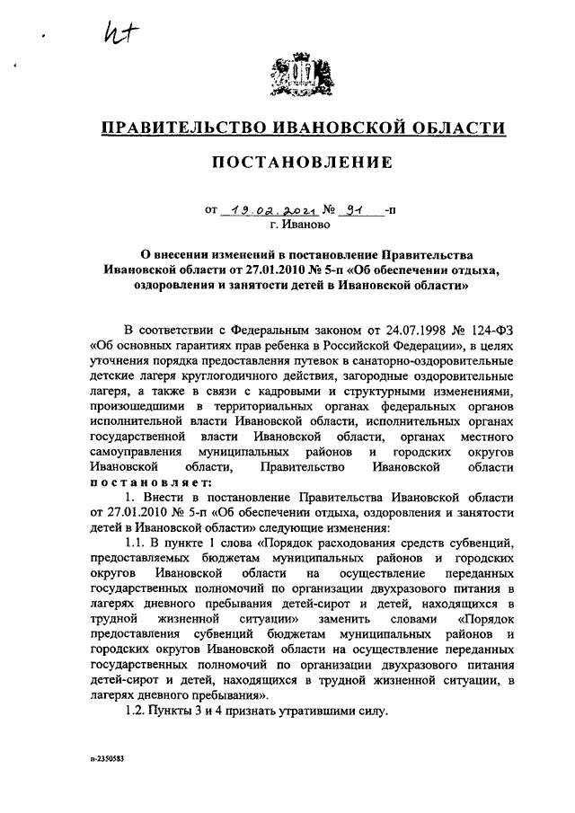 Постановление Правительства Ивановской области от 19.02.2021 N 91-п "О внесении изменений в постановление Правительства Ивановской области от 27.01.2010 N 5-п "Об обеспечении отдыха, оздоровления и занятости детей в Ивановской области" (вместе с "Порядком предоставления субвенций бюджетам муниципальных районов и городских округов Ивановской области на осуществление переданных государственных полномочий по организации двухразового питания детей-сирот и детей, находящихся в трудной жизненной ситуации, в лагерях дневного пребывания")