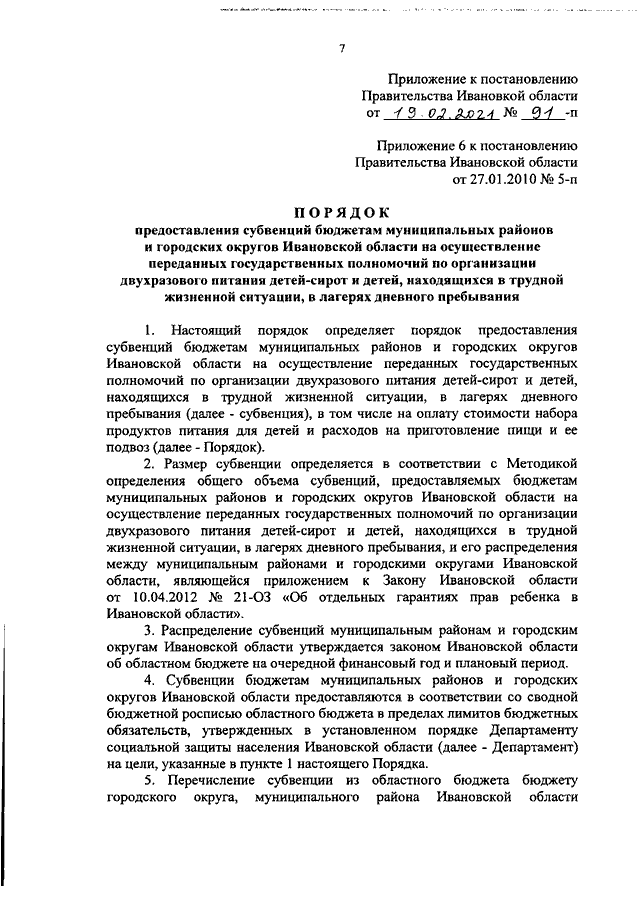 Постановление Правительства Ивановской области от 19.02.2021 N 91-п "О внесении изменений в постановление Правительства Ивановской области от 27.01.2010 N 5-п "Об обеспечении отдыха, оздоровления и занятости детей в Ивановской области" (вместе с "Порядком предоставления субвенций бюджетам муниципальных районов и городских округов Ивановской области на осуществление переданных государственных полномочий по организации двухразового питания детей-сирот и детей, находящихся в трудной жизненной ситуации, в лагерях дневного пребывания")