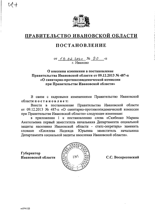 Постановление Правительства Ивановской области от 19.02.2021 N 90-п "О внесении изменения в постановление Правительства Ивановской области от 09.12.2013 N 487-п "О санитарно-противоэпидемической комиссии при Правительстве Ивановской области"