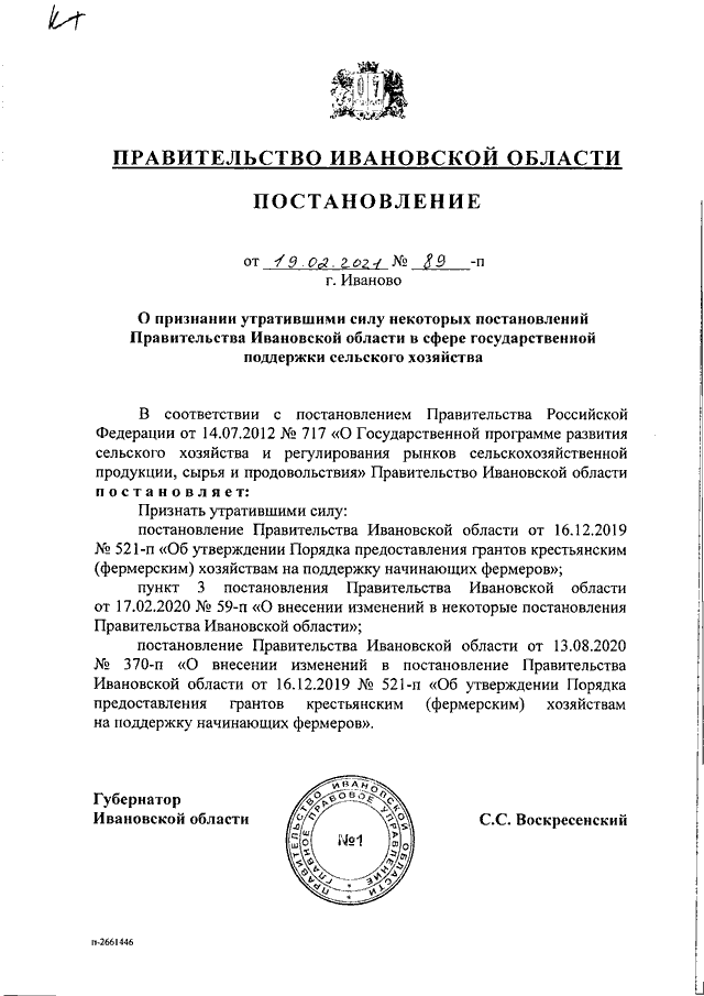 Постановление Правительства Ивановской области от 19.02.2021 N 89-п "О признании утратившими силу некоторых постановлений Правительства Ивановской области в сфере государственной поддержки сельского хозяйства"