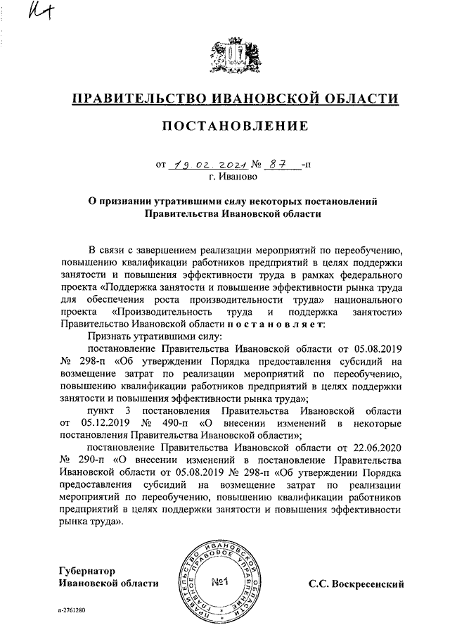 Постановление Правительства Ивановской области от 19.02.2021 N 87-п "О признании утратившими силу некоторых постановлений Правительства Ивановской области"