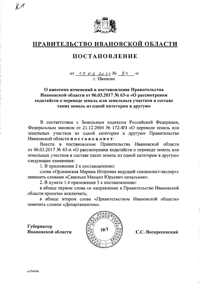 Постановление Правительства Ивановской области от 19.02.2021 N 84-п "О внесении изменений в постановление Правительства Ивановской области от 06.03.2017 N 63-п "О рассмотрении ходатайств о переводе земель или земельных участков в составе таких земель из одной категории в другую"