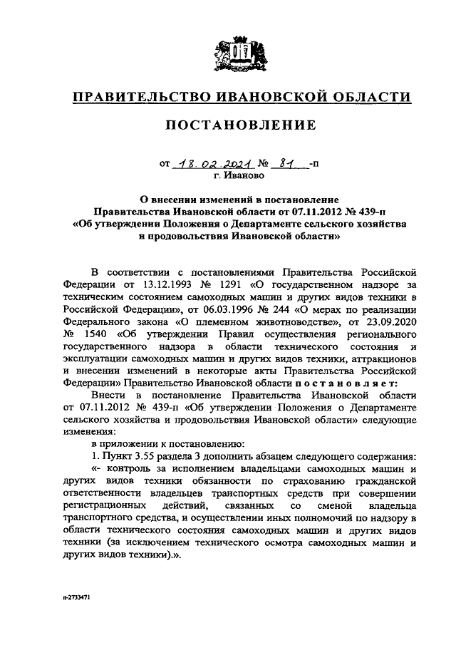 Постановление Правительства Ивановской области от 18.02.2021 N 81-п "О внесении изменений в постановление Правительства Ивановской области от 07.11.2012 N 439-п "Об утверждении Положения о Департаменте сельского хозяйства и продовольствия Ивановской области"