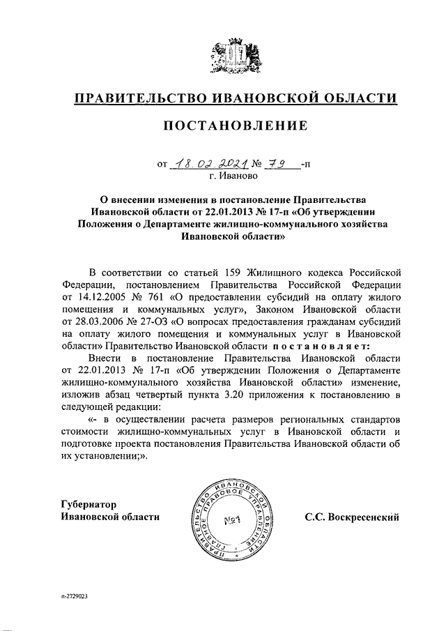 Постановление Правительства Ивановской области от 18.02.2021 N 79-п "О внесении изменения в постановление Правительства Ивановской области от 22.01.2013 N 17-п "Об утверждении Положения о Департаменте жилищно-коммунального хозяйства Ивановской области"