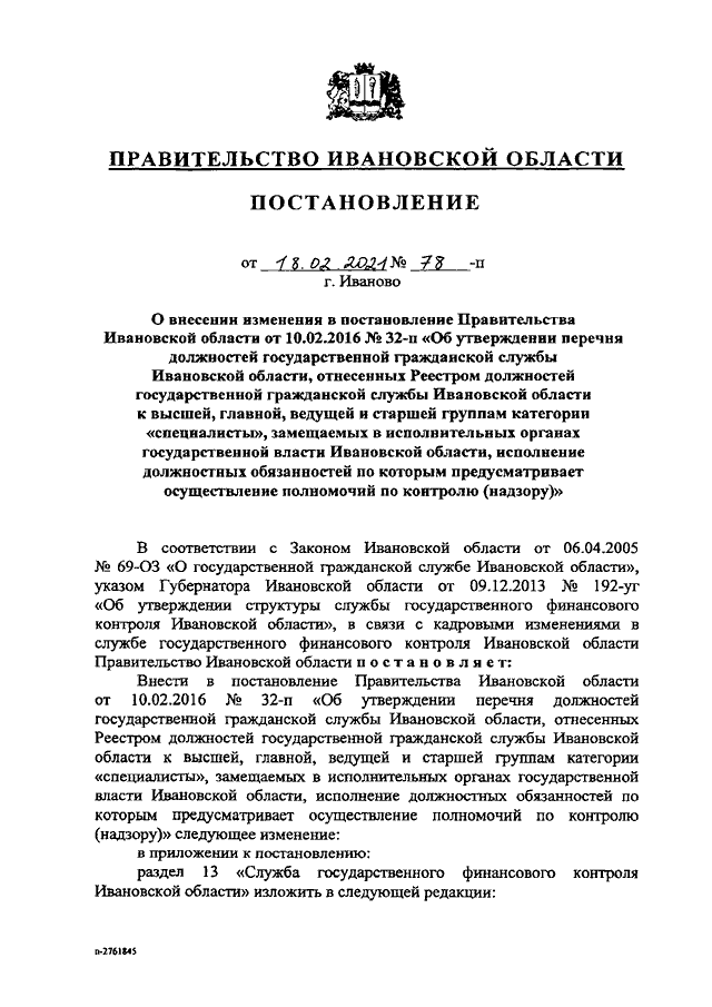 Постановление Правительства Ивановской области от 18.02.2021 N 78-п "О внесении изменения в постановление Правительства Ивановской области от 10.02.2016 N 32-п "Об утверждении перечня должностей государственной гражданской службы Ивановской области, отнесенных Реестром должностей государственной гражданской службы Ивановской области к высшей, главной, ведущей и старшей группам категории "специалисты", замещаемых в исполнительных органах государственной власти Ивановской области, исполнение должностных обязанностей по которым предусматривает осуществление полномочий по контролю (надзору)"