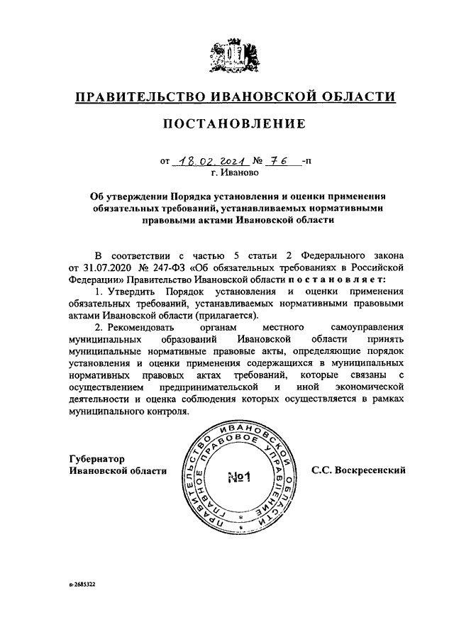 Постановление Правительства Ивановской области от 18.02.2021 N 76-п "Об утверждении Порядка установления и оценки применения обязательных требований, устанавливаемых нормативными правовыми актами Ивановской области"