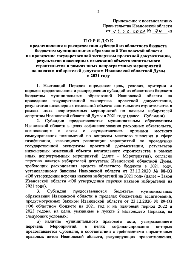 Постановление Правительства Ивановской области от 18.02.2021 N 74-п "Об утверждении Порядка предоставления и распределения субсидий из областного бюджета бюджетам муниципальных образований Ивановской области на проведение государственной экспертизы проектной документации, результатов инженерных изысканий объекта капитального строительства в рамках иных непрограммных мероприятий по наказам избирателей депутатам Ивановской областной Думы в 2021 году"