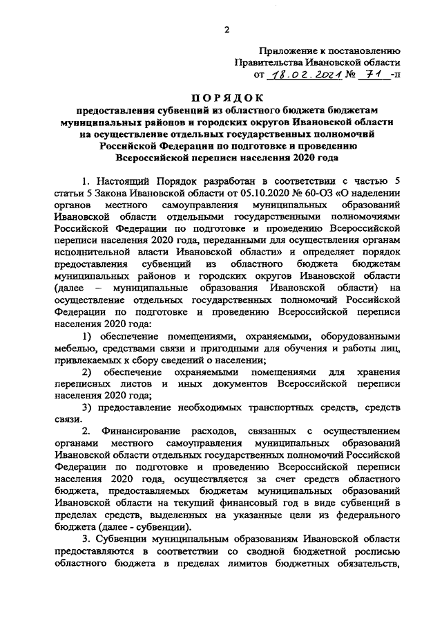 Постановление Правительства Ивановской области от 18.02.2021 N 71-п "Об утверждении Порядка предоставления субвенций из областного бюджета бюджетам муниципальных районов и городских округов Ивановской области на осуществление отдельных государственных полномочий Российской Федерации по подготовке и проведению Всероссийской переписи населения 2020 года"
