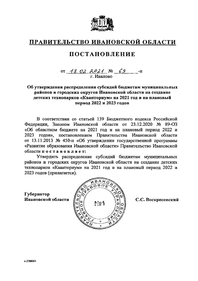 Постановление Правительства Ивановской области от 18.02.2021 N 69-п "Об утверждении распределения субсидий бюджетам муниципальных районов и городских округов Ивановской области на создание детских технопарков "Кванториум" на 2021 год и на плановый период 2022 и 2023 годов"
