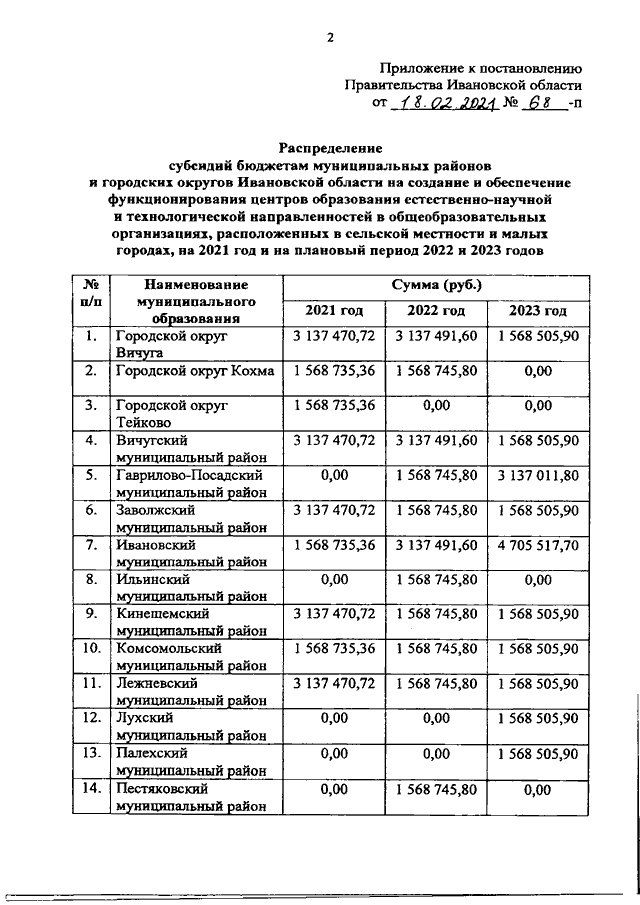 Постановление Правительства Ивановской области от 18.02.2021 N 68-п "Об утверждении распределения субсидий бюджетам муниципальных районов и городских округов Ивановской области на создание и обеспечение функционирования центров образования естественно-научной и технологической направленностей в общеобразовательных организациях, расположенных в сельской местности и малых городах, на 2021 год и на плановый период 2022 и 2023 годов"