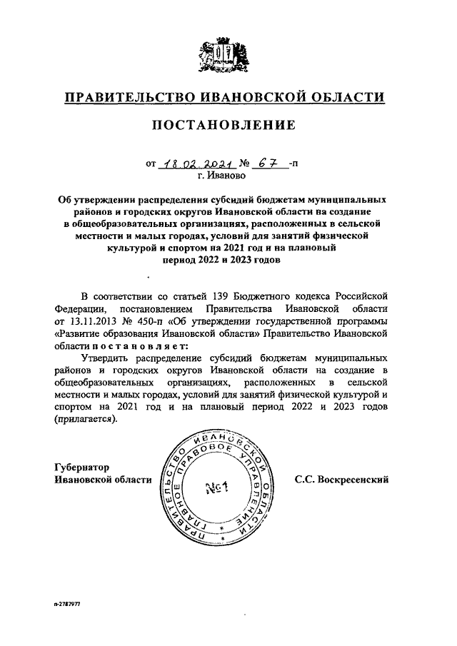 Постановление Правительства Ивановской области от 18.02.2021 N 67-п "Об утверждении распределения субсидий бюджетам муниципальных районов и городских округов Ивановской области на создание в общеобразовательных организациях, расположенных в сельской местности и малых городах, условий для занятий физической культурой и спортом на 2021 год и на плановый период 2022 и 2023 годов"