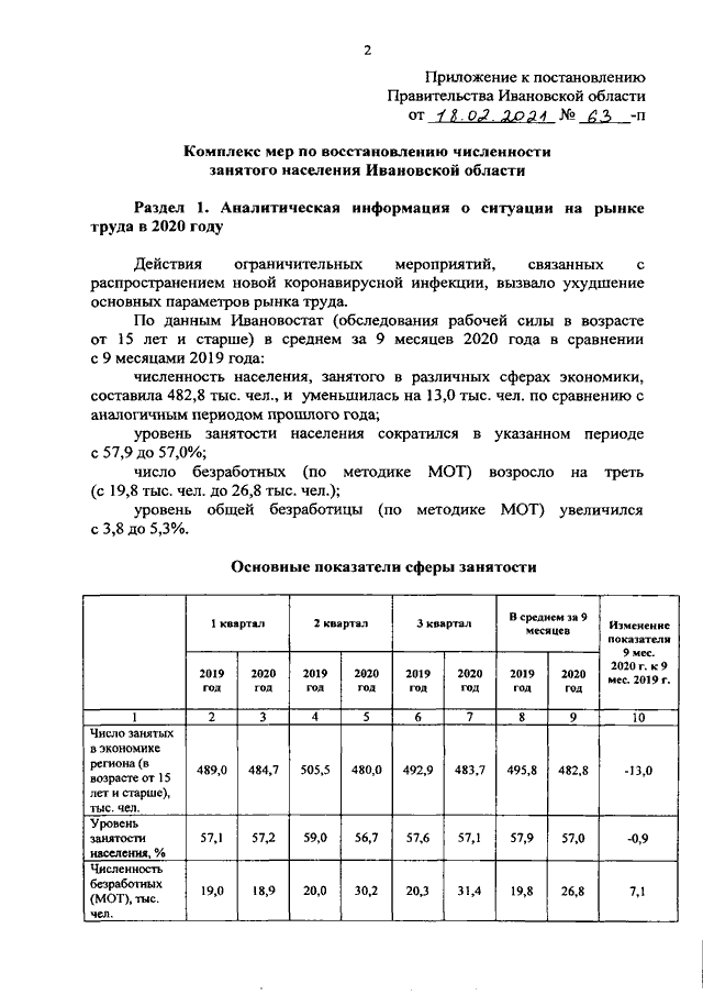 Постановление Правительства Ивановской области от 18.02.2021 N 63-п "Об утверждении Комплекса мер по восстановлению численности занятого населения Ивановской области"