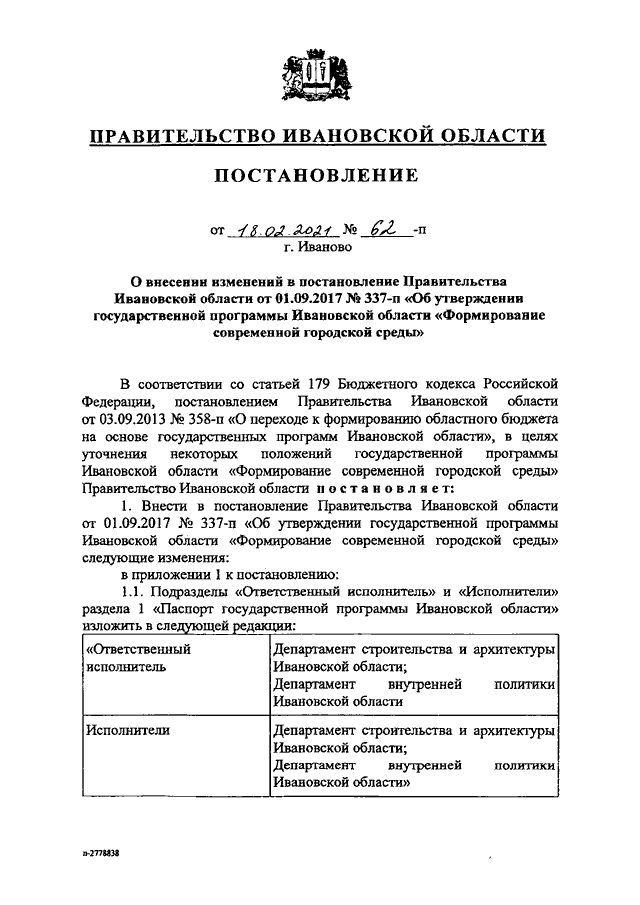 Постановление Правительства Ивановской области от 18.02.2021 N 62-п "О внесении изменений в постановление Правительства Ивановской области от 01.09.2017 N 337-п "Об утверждении государственной программы Ивановской области "Формирование современной городской среды"