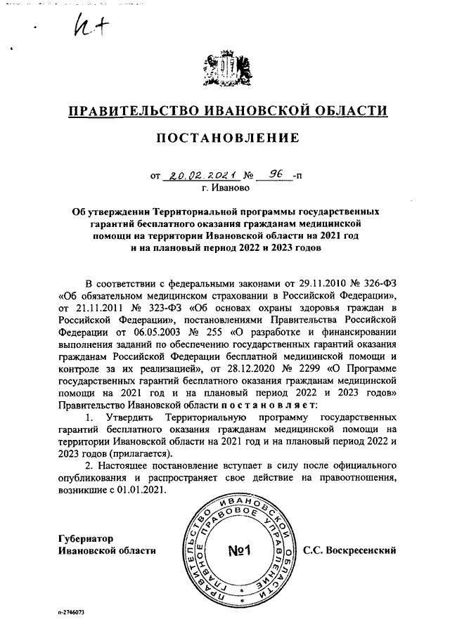 Постановление Правительства Ивановской области от 20.02.2021 N 96-п "Об утверждении Территориальной программы государственных гарантий бесплатного оказания гражданам медицинской помощи на территории Ивановской области на 2021 год и на плановый период 2022 и 2023 годов"