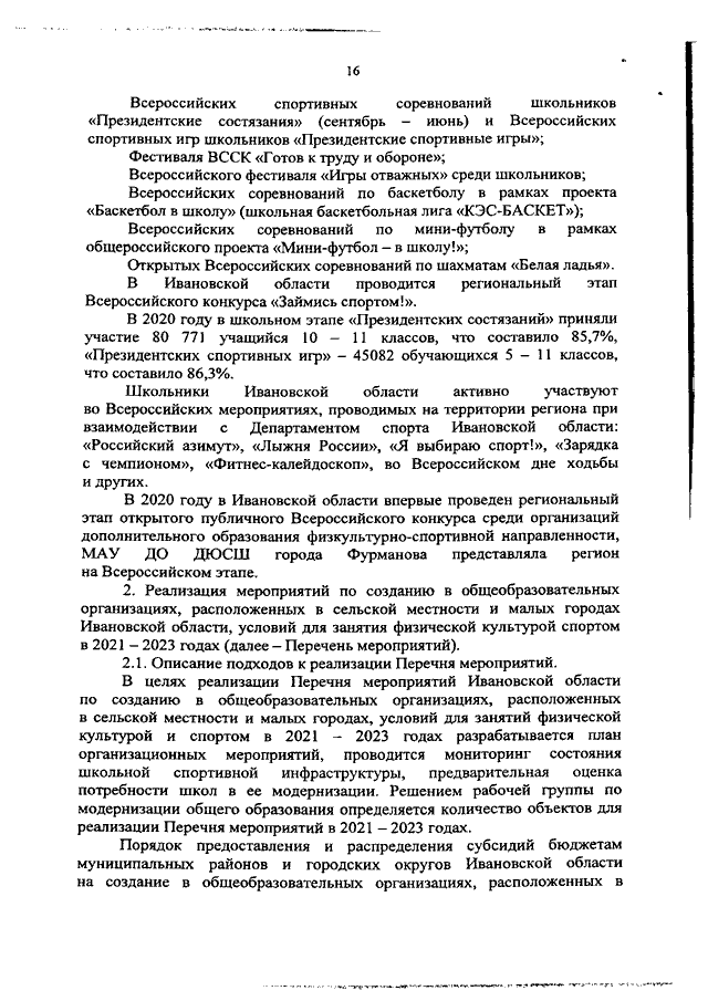 Распоряжение Правительства Ивановской области от 01.03.2021 N 23-рп "О создании в общеобразовательных организациях, расположенных в сельской местности и малых городах Ивановской области, условий для занятия физической культурой и спортом в 2021 - 2023 годах" (вместе с "Перечнем мероприятий по созданию в общеобразовательных организациях Ивановской области, расположенных в сельской местности и малых городах, условий для занятий физической культурой и спортом в 2021 - 2023 годах")