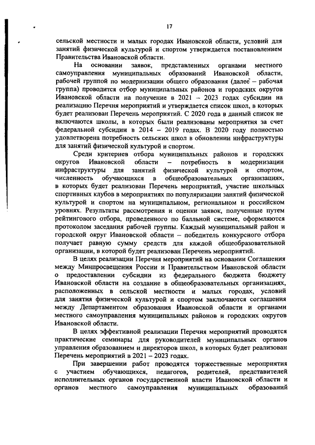 Распоряжение Правительства Ивановской области от 01.03.2021 N 23-рп "О создании в общеобразовательных организациях, расположенных в сельской местности и малых городах Ивановской области, условий для занятия физической культурой и спортом в 2021 - 2023 годах" (вместе с "Перечнем мероприятий по созданию в общеобразовательных организациях Ивановской области, расположенных в сельской местности и малых городах, условий для занятий физической культурой и спортом в 2021 - 2023 годах")