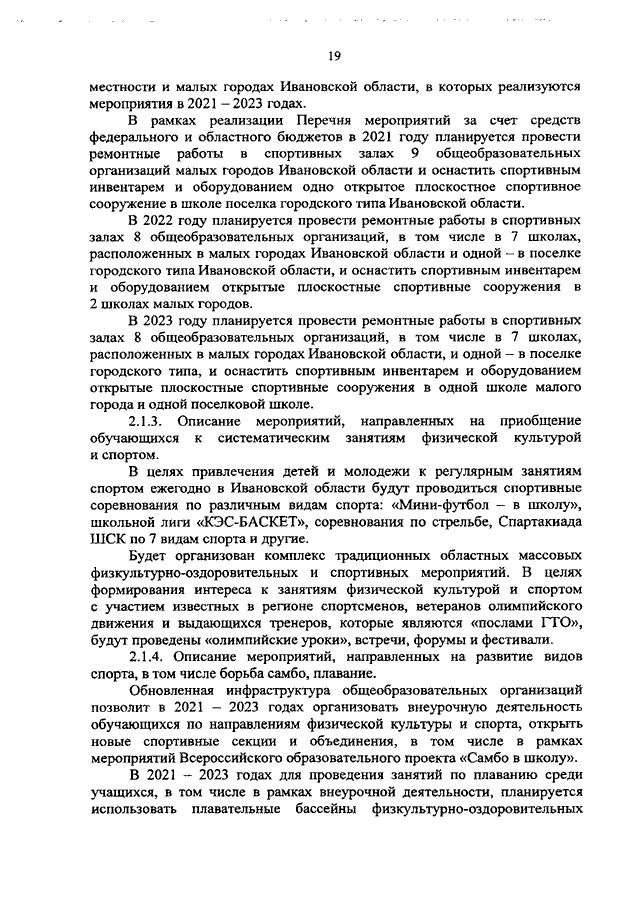 Распоряжение Правительства Ивановской области от 01.03.2021 N 23-рп "О создании в общеобразовательных организациях, расположенных в сельской местности и малых городах Ивановской области, условий для занятия физической культурой и спортом в 2021 - 2023 годах" (вместе с "Перечнем мероприятий по созданию в общеобразовательных организациях Ивановской области, расположенных в сельской местности и малых городах, условий для занятий физической культурой и спортом в 2021 - 2023 годах")