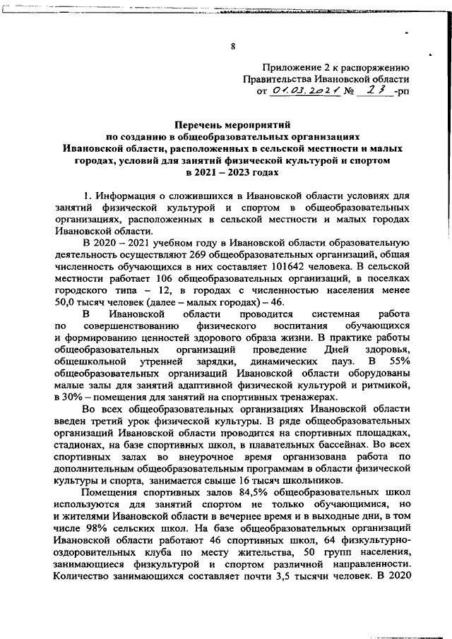 Распоряжение Правительства Ивановской области от 01.03.2021 N 23-рп "О создании в общеобразовательных организациях, расположенных в сельской местности и малых городах Ивановской области, условий для занятия физической культурой и спортом в 2021 - 2023 годах" (вместе с "Перечнем мероприятий по созданию в общеобразовательных организациях Ивановской области, расположенных в сельской местности и малых городах, условий для занятий физической культурой и спортом в 2021 - 2023 годах")