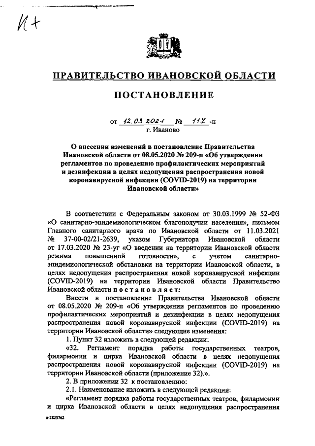 Постановление Правительства Ивановской области от 12.03.2021 N 117-п "О внесении изменений в постановление Правительства Ивановской области от 08.05.2020 N 209-п "Об утверждении регламентов по проведению профилактических мероприятий и дезинфекции в целях недопущения распространения новой коронавирусной инфекции (COVID-2019) на территории Ивановской области"