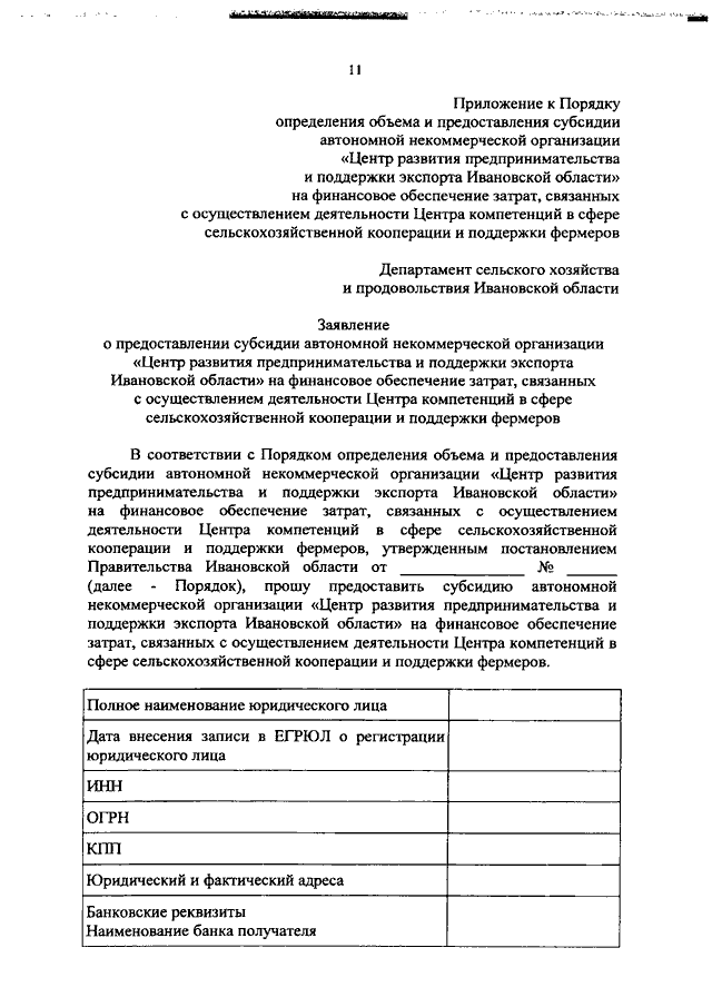 Постановление Правительства Ивановской области от 11.03.2021 N 104-п "О предоставлении субсидии автономной некоммерческой организации "Центр развития предпринимательства и поддержки экспорта Ивановской области" на финансовое обеспечение затрат, связанных с осуществлением деятельности Центра компетенций в сфере сельскохозяйственной кооперации и поддержки фермеров" (вместе с "Порядком определения объема и предоставления субсидии автономной некоммерческой организации "Центр развития предпринимательства и поддержки экспорта Ивановской области" на финансовое обеспечение затрат, связанных с осуществлением деятельности центра компетенций в сфере сельскохозяйственной кооперации и поддержки фермеров")