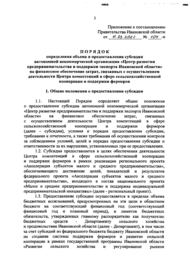 Постановление Правительства Ивановской области от 11.03.2021 N 104-п "О предоставлении субсидии автономной некоммерческой организации "Центр развития предпринимательства и поддержки экспорта Ивановской области" на финансовое обеспечение затрат, связанных с осуществлением деятельности Центра компетенций в сфере сельскохозяйственной кооперации и поддержки фермеров" (вместе с "Порядком определения объема и предоставления субсидии автономной некоммерческой организации "Центр развития предпринимательства и поддержки экспорта Ивановской области" на финансовое обеспечение затрат, связанных с осуществлением деятельности центра компетенций в сфере сельскохозяйственной кооперации и поддержки фермеров")