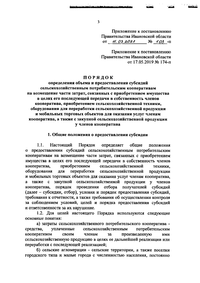 Постановление Правительства Ивановской области от 11.03.2021 N 103-п "О внесении изменений в постановление Правительства Ивановской области от 17.05.2019 N 174-п "Об утверждении Порядка определения объема и предоставления субсидий сельскохозяйственным потребительским кооперативам на возмещение части затрат, связанных с приобретением имущества в целях его последующей передачи в собственность членов кооператива, приобретением сельскохозяйственной техники, оборудования для переработки сельскохозяйственной продукции и мобильных торговых объектов для оказания услуг членам кооператива, а также с закупкой сельскохозяйственной продукции у членов кооператива"