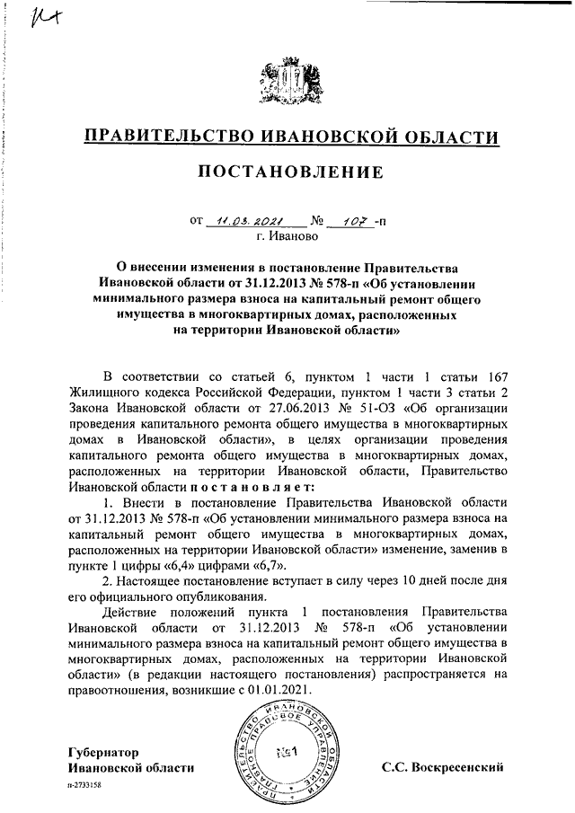 Постановление Правительства Ивановской области от 11.03.2021 N 107-п "О внесении изменения в постановление Правительства Ивановской области от 31.12.2013 N 578-п "Об установлении минимального размера взноса на капитальный ремонт общего имущества в многоквартирных домах, расположенных на территории Ивановской области"