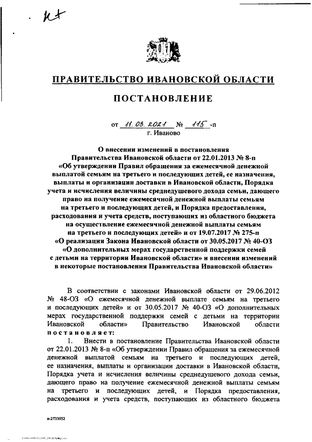 Постановление Правительства Ивановской области от 11.03.2021 N 115-п "О внесении изменений в постановления Правительства Ивановской области от 22.01.2013 N 8-п "Об утверждении Правил обращения за ежемесячной денежной выплатой семьям на третьего и последующих детей, ее назначения, выплаты и организации доставки в Ивановской области, Порядка учета и исчисления величины среднедушевого дохода семьи, дающего право на получение ежемесячной денежной выплаты семьям на третьего и последующих детей, и Порядка предоставления, расходования и учета средств, поступающих из областного бюджета на осуществление ежемесячной денежной выплаты семьям на третьего и последующих детей" и от 19.07.2017 N 275-п "О реализации Закона Ивановской области от 30.05.2017 N 40-ОЗ "О дополнительных мерах государственной поддержки семей с детьми на территории Ивановской области" и внесении изменений в некоторые постановления Правительства Ивановской области"