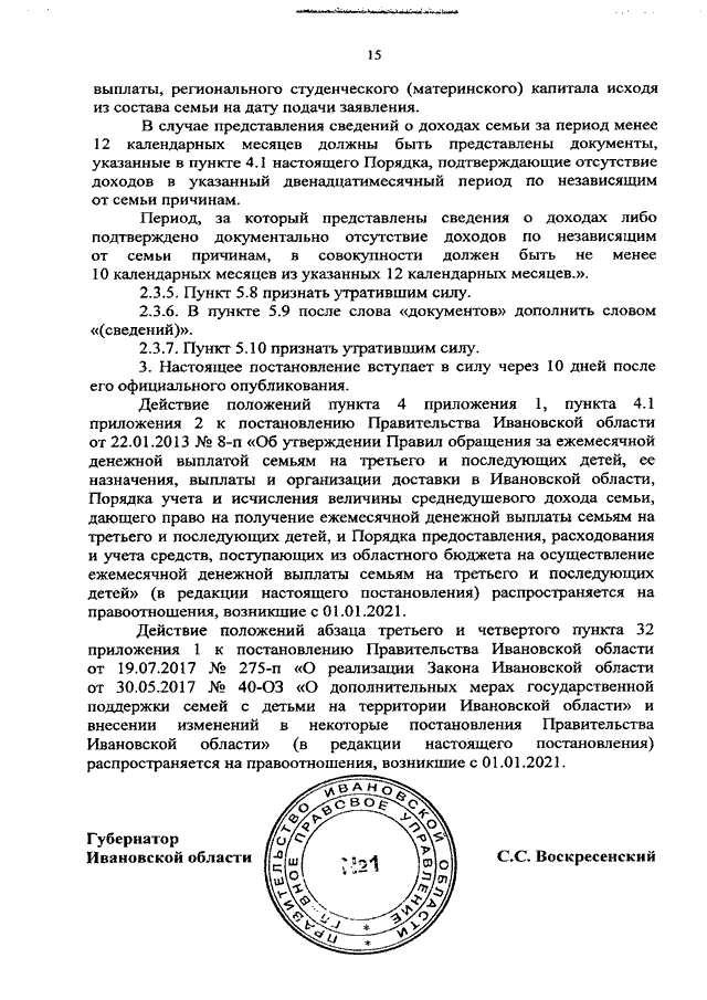 Постановление Правительства Ивановской области от 11.03.2021 N 115-п "О внесении изменений в постановления Правительства Ивановской области от 22.01.2013 N 8-п "Об утверждении Правил обращения за ежемесячной денежной выплатой семьям на третьего и последующих детей, ее назначения, выплаты и организации доставки в Ивановской области, Порядка учета и исчисления величины среднедушевого дохода семьи, дающего право на получение ежемесячной денежной выплаты семьям на третьего и последующих детей, и Порядка предоставления, расходования и учета средств, поступающих из областного бюджета на осуществление ежемесячной денежной выплаты семьям на третьего и последующих детей" и от 19.07.2017 N 275-п "О реализации Закона Ивановской области от 30.05.2017 N 40-ОЗ "О дополнительных мерах государственной поддержки семей с детьми на территории Ивановской области" и внесении изменений в некоторые постановления Правительства Ивановской области"