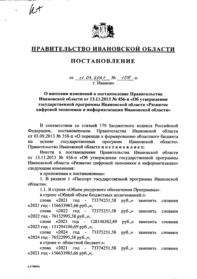 Постановление Правительства Ивановской области от 11.03.2021 N 109-п "О внесении изменений в постановление Правительства Ивановской области от 13.11.2013 N 456-п "Об утверждении государственной программы Ивановской области "Развитие цифровой экономики и информатизации Ивановской области"