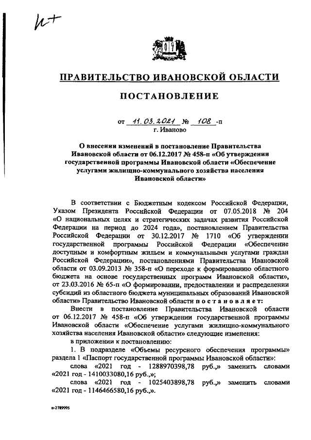 Постановление Правительства Ивановской области от 11.03.2021 N 108-п "О внесении изменений в постановление Правительства Ивановской области от 06.12.2017 N 458-п "Об утверждении государственной программы Ивановской области "Обеспечение услугами жилищно-коммунального хозяйства населения Ивановской области"