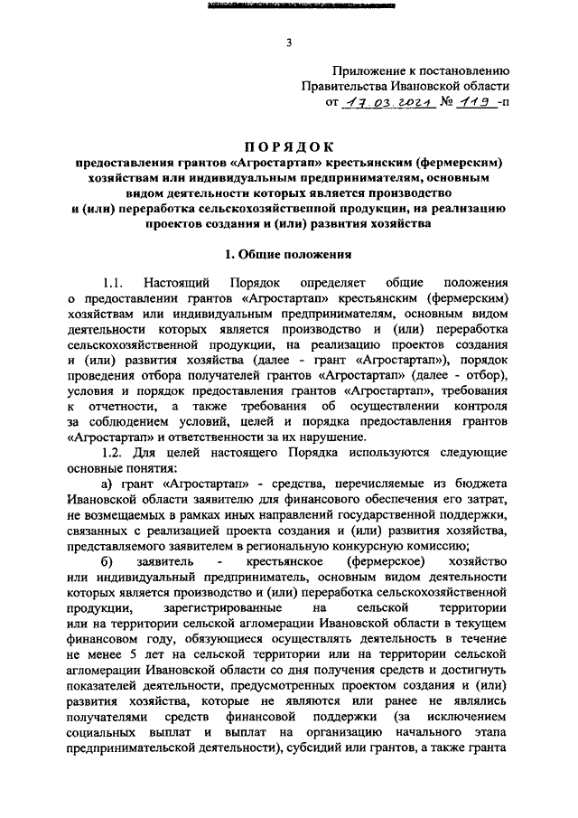 Постановление Правительства Ивановской области от 17.03.2021 N 119-п "Об утверждении Порядка предоставления грантов "Агростартап" крестьянским (фермерским) хозяйствам или индивидуальным предпринимателям, основным видом деятельности которых является производство и (или) переработка сельскохозяйственной продукции, на реализацию проектов создания и (или) развития хозяйства"