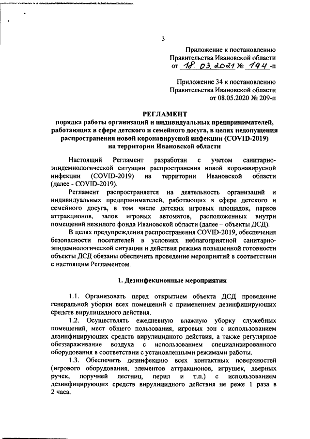 Постановление Правительства Ивановской области от 18.03.2021 N 144-п "О внесении изменений в постановление Правительства Ивановской области от 08.05.2020 N 209-п "Об утверждении регламентов по проведению профилактических мероприятий и дезинфекции в целях недопущения распространения новой коронавирусной инфекции (COVID-2019) на территории Ивановской области" (вместе с "Регламентом порядка работы организаций и индивидуальных предпринимателей, работающих в сфере детского и семейного досуга, в целях недопущения распространения новой коронавирусной инфекции (COVID-2019) на территории Ивановской области")