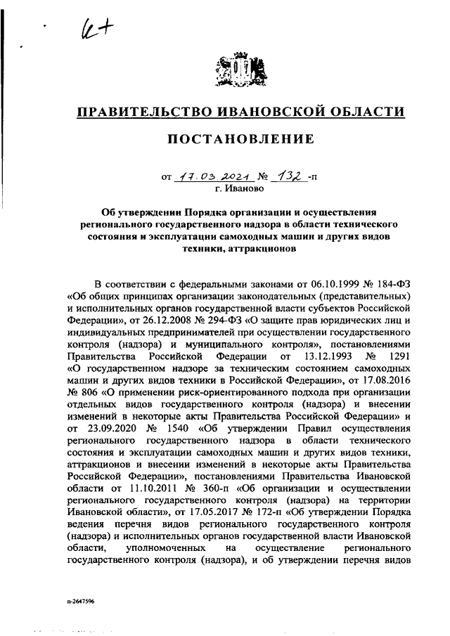Постановление Правительства Ивановской области от 17.03.2021 N 132-п "Об утверждении Порядка организации и осуществления регионального государственного надзора в области технического состояния и эксплуатации самоходных машин и других видов техники, аттракционов"