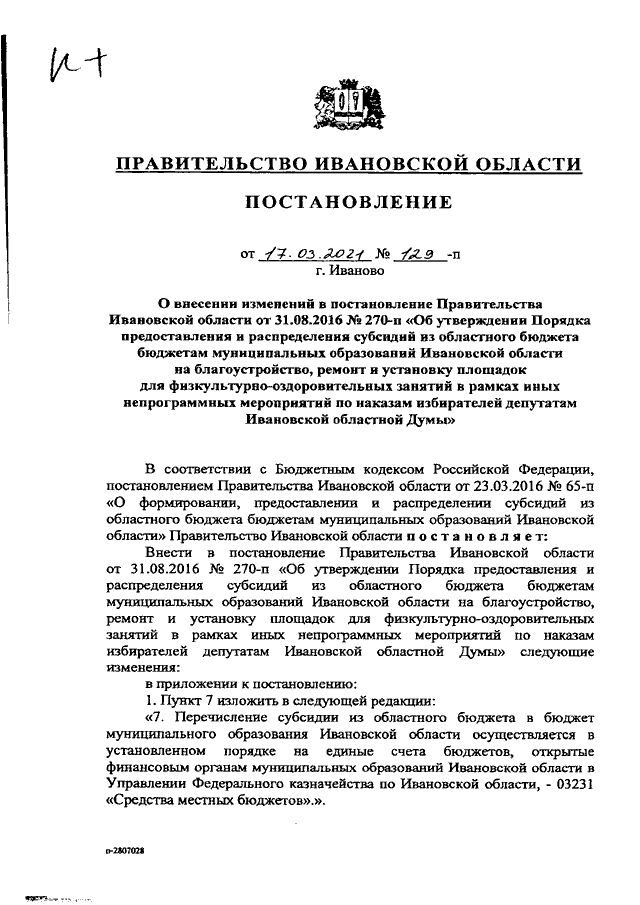 Постановление Правительства Ивановской области от 17.03.2021 N 129-п "О внесении изменений в постановление Правительства Ивановской области от 31.08.2016 N 270-п "Об утверждении Порядка предоставления и распределения субсидий из областного бюджета бюджетам муниципальных образований Ивановской области на благоустройство, ремонт и установку площадок для физкультурно-оздоровительных занятий в рамках иных непрограммных мероприятий по наказам избирателей депутатам Ивановской областной Думы"