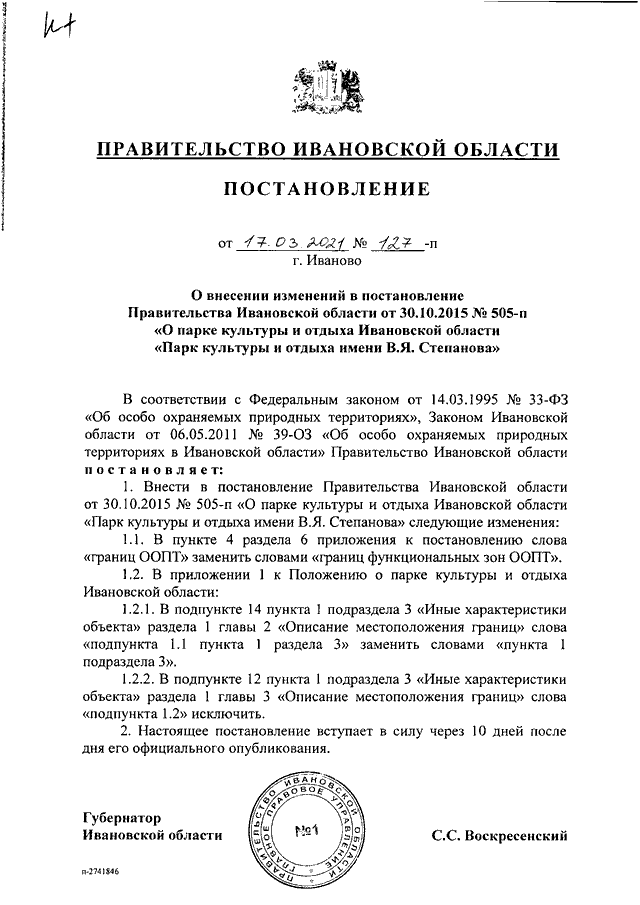 Постановление Правительства Ивановской области от 17.03.2021 N 127-п "О внесении изменений в постановление Правительства Ивановской области от 30.10.2015 N 505-п "О парке культуры и отдыха Ивановской области "Парк культуры и отдыха имени В.Я. Степанова"