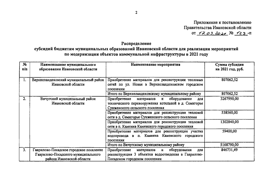 Постановление Правительства Ивановской области от 17.03.2021 N 123-п "О распределении субсидий бюджетам муниципальных образований Ивановской области для реализации мероприятий по модернизации объектов коммунальной инфраструктуры в 2021 году"