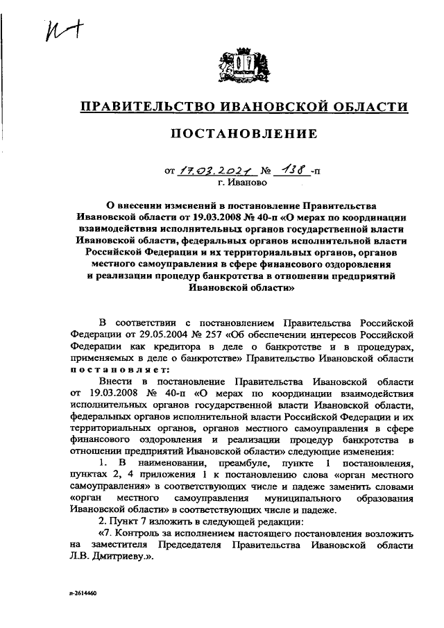 Постановление Правительства Ивановской области от 17.03.2021 N 138-п "О внесении изменений в постановление Правительства Ивановской области от 19.03.2008 N 40-п "О мерах по координации взаимодействия исполнительных органов государственной власти Ивановской области, федеральных органов исполнительной власти Российской Федерации и их территориальных органов, органов местного самоуправления в сфере финансового оздоровления и реализации процедур банкротства в отношении предприятий Ивановской области"