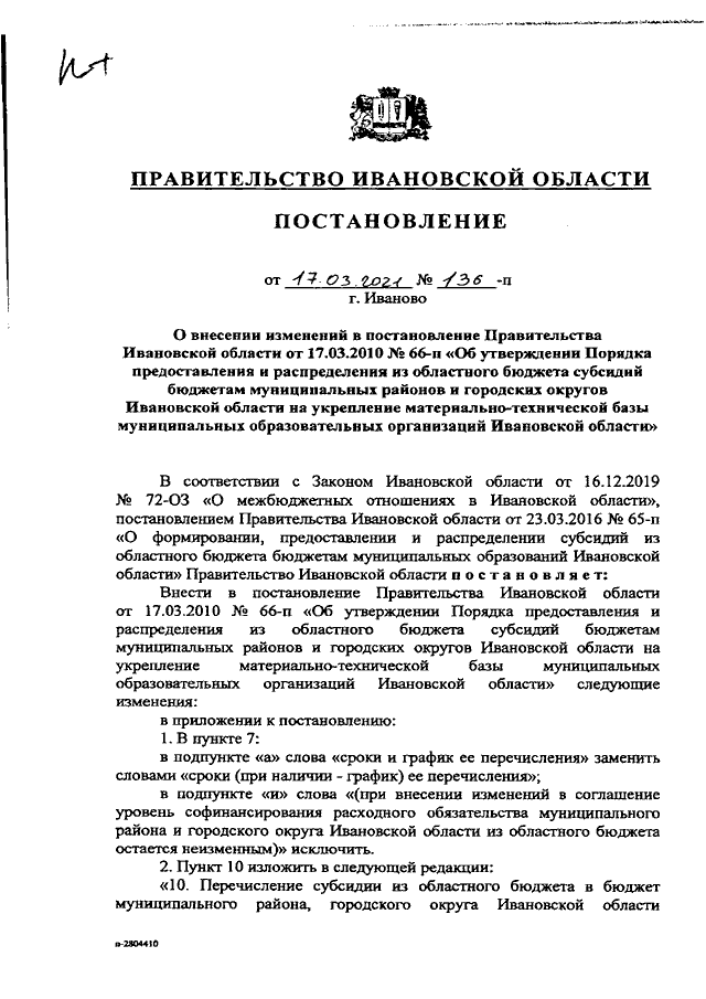 Постановление Правительства Ивановской области от 17.03.2021 N 136-п "О внесении изменений в постановление Правительства Ивановской области от 17.03.2010 N 66-п "Об утверждении Порядка предоставления и распределения из областного бюджета субсидий бюджетам муниципальных районов и городских округов Ивановской области на укрепление материально-технической базы муниципальных образовательных организаций Ивановской области"