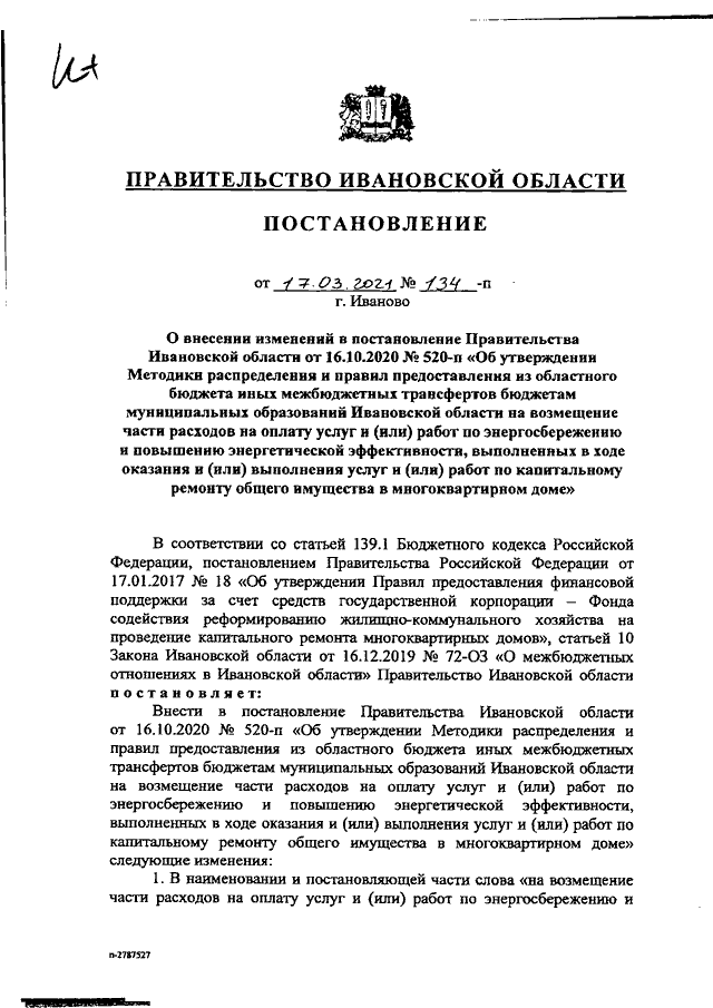 Постановление Правительства Ивановской области от 17.03.2021 N 134-п "О внесении изменений в постановление Правительства Ивановской области от 16.10.2020 N 520-п "Об утверждении Методики распределения и правил предоставления из областного бюджета иных межбюджетных трансфертов бюджетам муниципальных образований Ивановской области на возмещение части расходов на оплату услуг и (или) работ по энергосбережению и повышению энергетической эффективности, выполненных в ходе оказания и (или) выполнения услуг и (или) работ по капитальному ремонту общего имущества в многоквартирном доме"