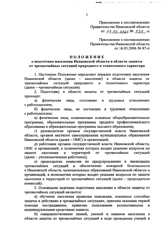 Постановление Правительства Ивановской области от 17.03.2021 N 131-п "О внесении изменений в некоторые постановления Правительства Ивановской области в области защиты населения и территорий Ивановской области от чрезвычайных ситуаций природного и техногенного характера" (вместе с "Положением о подготовке населения Ивановской области в области защиты от чрезвычайных ситуаций природного и техногенного характера")