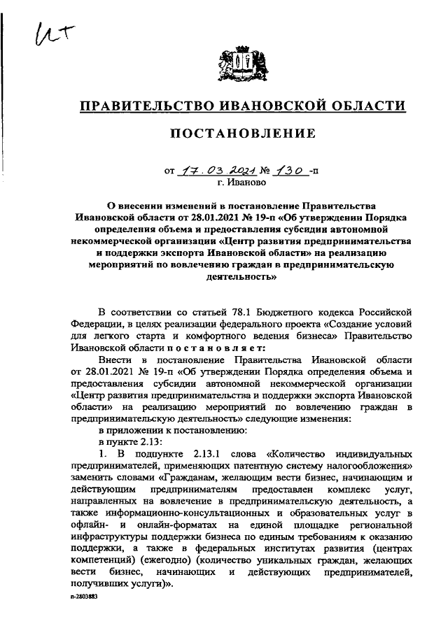 Постановление Правительства Ивановской области от 17.03.2021 N 130-п "О внесении изменений в постановление Правительства Ивановской области от 28.01.2021 N 19-п "Об утверждении Порядка определения объема и предоставления субсидии автономной некоммерческой организации "Центр развития предпринимательства и поддержки экспорта Ивановской области" на реализацию мероприятий по вовлечению граждан в предпринимательскую деятельность"