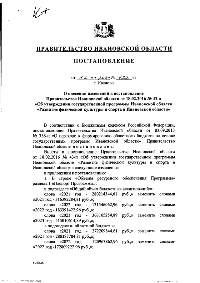 Постановление Правительства Ивановской области от 17.03.2021 N 122-п "О внесении изменений в постановление Правительства Ивановской области от 18.02.2016 N 43-п "Об утверждении государственной программы Ивановской области "Развитие физической культуры и спорта в Ивановской области"