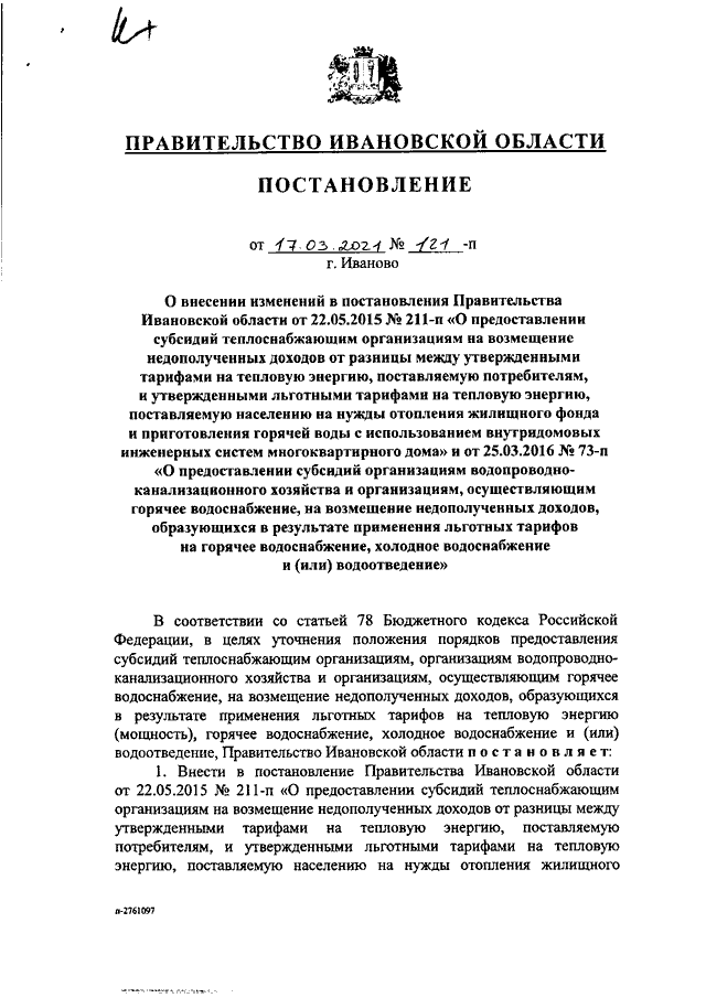 Постановление Правительства Ивановской области от 17.03.2021 N 121-п "О внесении изменений в постановления Правительства Ивановской области от 22.05.2015 N 211-п "О предоставлении субсидий теплоснабжающим организациям на возмещение недополученных доходов от разницы между утвержденными тарифами на тепловую энергию, поставляемую потребителям, и утвержденными льготными тарифами на тепловую энергию, поставляемую населению на нужды отопления жилищного фонда и приготовления горячей воды с использованием внутридомовых инженерных систем многоквартирного дома" и от 25.03.2016 N 73-п "О предоставлении субсидий организациям водопроводно-канализационного хозяйства и организациям, осуществляющим горячее водоснабжение, на возмещение недополученных доходов, образующихся в результате применения льготных тарифов на горячее водоснабжение, холодное водоснабжение и (или) водоотведение"
