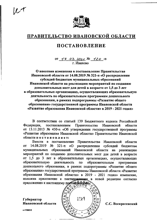 Постановление Правительства Ивановской области от 17.03.2021 N 120-п "О внесении изменения в постановление Правительства Ивановской области от 14.08.2019 N 321-п "О распределении субсидий бюджетам муниципальных образований Ивановской области на реализацию мероприятий по созданию дополнительных мест для детей в возрасте от 1,5 до 3 лет в образовательных организациях, осуществляющих образовательную деятельность по образовательным программам дошкольного образования, в рамках подпрограммы "Развитие общего образования" государственной программы Ивановской области "Развитие образования Ивановской области" в 2019 - 2021 годах"