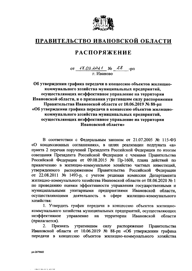 Распоряжение Правительства Ивановской области от 17.03.2021 N 28-рп "Об утверждении графика передачи в концессию объектов жилищно-коммунального хозяйства муниципальных предприятий, осуществляющих неэффективное управление на территории Ивановской области, и о признании утратившим силу распоряжения Правительства Ивановской области от 10.06.2019 N 88-рп "Об утверждении графика передачи в концессию объектов жилищно-коммунального хозяйства муниципальных предприятий, осуществляющих неэффективное управление на территории Ивановской области"